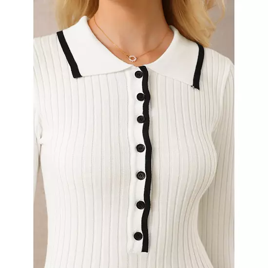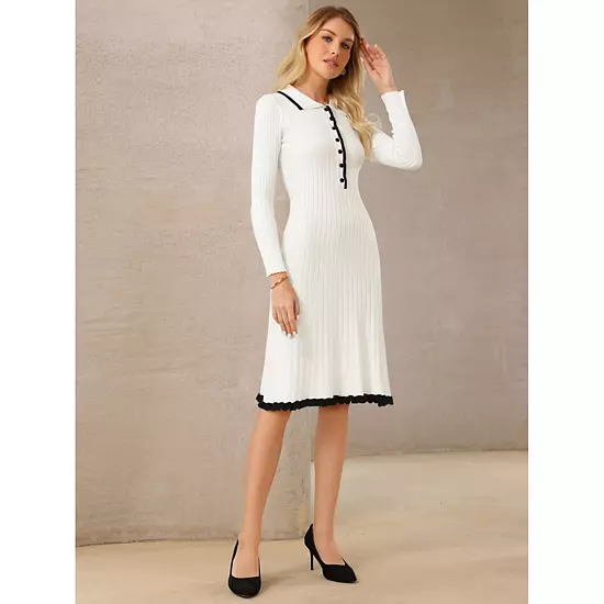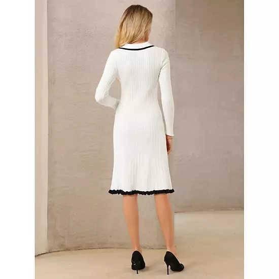 Keep your look elegant in this sweater dress, featuring contrast color trim, polo neck, button down, collared, long sleeve, ruffled hem, A-line, knitted ribbed fabric, midi; Pair with elegant necklace and high heels for a chic office look; Comfortable and classic, this semi-formal fall dress is perfect on its own or as a layer under a blazer or jacket; Focused on Ladies’ Semi-Formal Wear – This knitted sweater dress can be a perfect addition to almost any outfit from formal to daily wear, great for work, meeting, office, casual, daily dressing, etc.