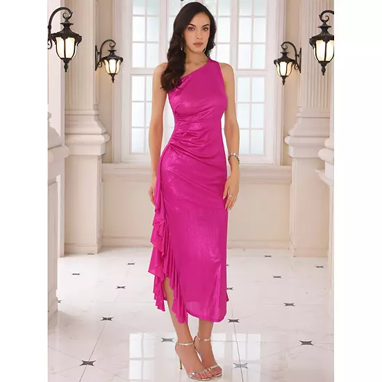 To be the shiny star in the crowd with ruched maxi dress featuring ruffle trim and sleeveless to show your charming; This metallic long dress is a stunning choice for semi-formal or formal occasion like cocktail, evening, party, club, wedding guest, bridesmaid, banquet, prom, etc; Pair this one shoulder dress with exquisite high heels, necklaces, earrings and clutch for a gorgeous and glamorous look.