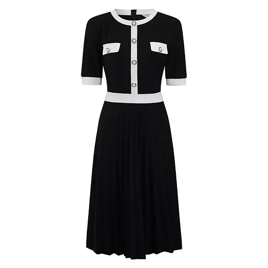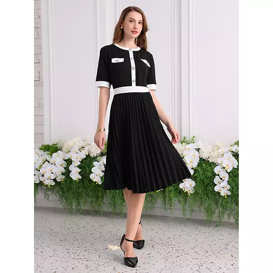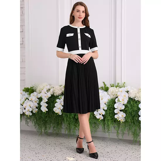 Keep your look stylish in this dress, featuring a round neck, pleated design, contrast color, short sleeve, button decor, A-Line and flare hem; This dress can be a perfect addition to almost any outfit from formal to daily wear, great for work, meeting, office, casual, daily dressing, etc; Pair with high heels for an elegant office look.