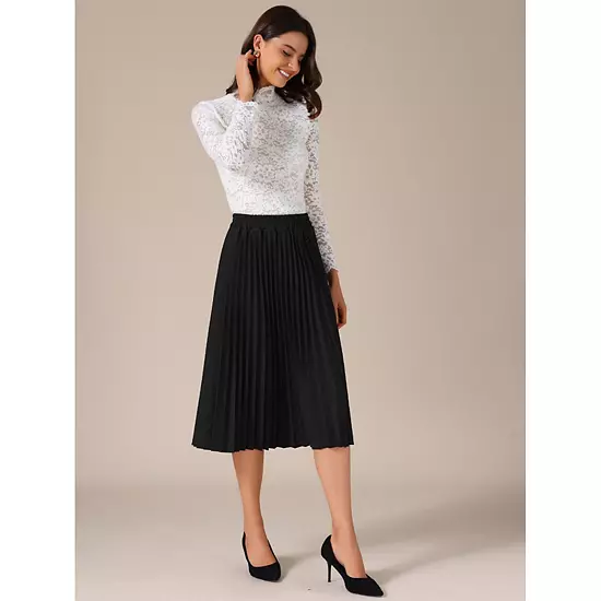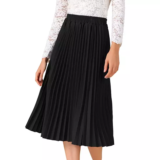 Pleated design brings graceful movement to this midi skirt that complements your day-to-night ensemble; A-line silhouette and midi length design create a flattering look; Perfect to pair with oversized shirts for a trendy outfit.