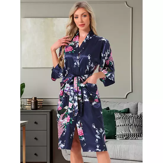 The floral print satin robe with V-neck, wide 3/4 sleeves with an active space to do anything, inner tie, and outside belt to show your graceful body curves. Unique peacock and peony flower patterns scatter on the robe, silky feel and look, Luxurious and elegant. The open closure style would make it easy to wear and take off. You will get a well fit through adjusting the self-closure at the waist. Perfect for Weddings, Bridal Shower, Slumber Party, Dressing, Home, Lounging, Cosplay, Nursing, Family Party. The light robe can be worn attractively from day to night.