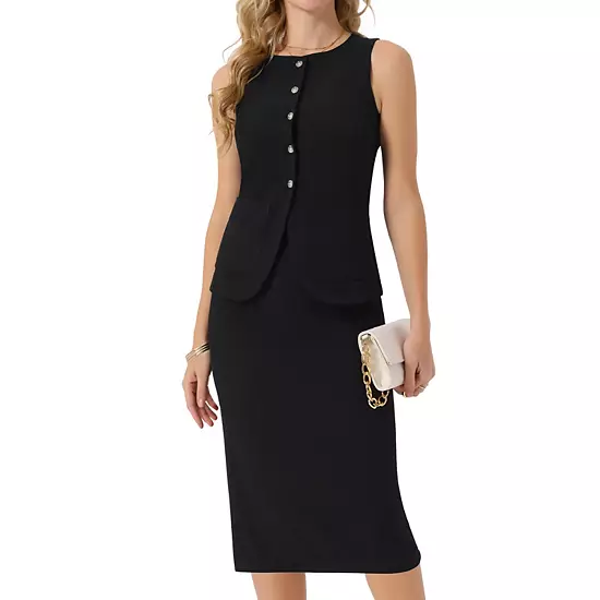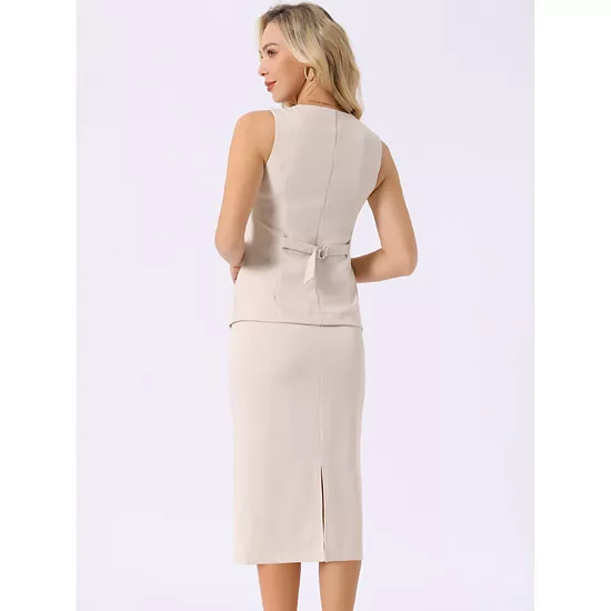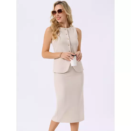 Our summer two-piece outfits are crafted from soft, breathable, and lightweight fabric, ensuring a smooth touch, exceptional wrinkle resistance, and comfortable wear, perfect for hot summer days; Features: This cozy set includes a sleeveless round neck top and high-waisted midi skirt. The sleeveless design with crewneck adds a modern touch, while the captivating front button-down detail enhances femininity. Loose-fitting slit skirt ensure ultimate comfort, exuding classic casual elegance; Style:Transition seamlessly from semi-formal to casual settings with our versatile two-piece set, destined to become a staple in every woman’s summer wardrobe; Occasions: Business skirt suit sets perfect for everyday wear. Whether it’s parties, night outs, weddings, or business events, this ensemble is suitable for various occasions; Our women’s fashion two-piece suit effortlessly complements high heels, handbags, and jewelry.