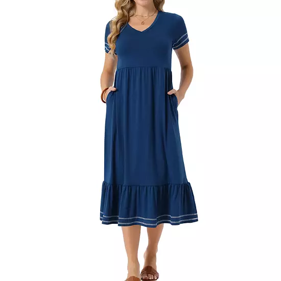 Midi casual dress is made from a soft and lightweight fabric, making it perfect for any season; Features:V Neck/Short Sleeve/Contrast Trim/Two Pockets/Casual Midi Dress; Style:Casual short sleeve dress classy, cute and you’ll love it. The casual midi dress is all things sweet and everything you need! Also can be wear as a maternity dress; Occasion :The women midi dress making for an important event, vacation, dating; The summer dress has a chic and understated design that makes it easy to accessorize with your favorite shoes.