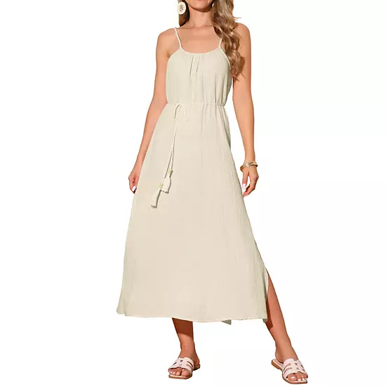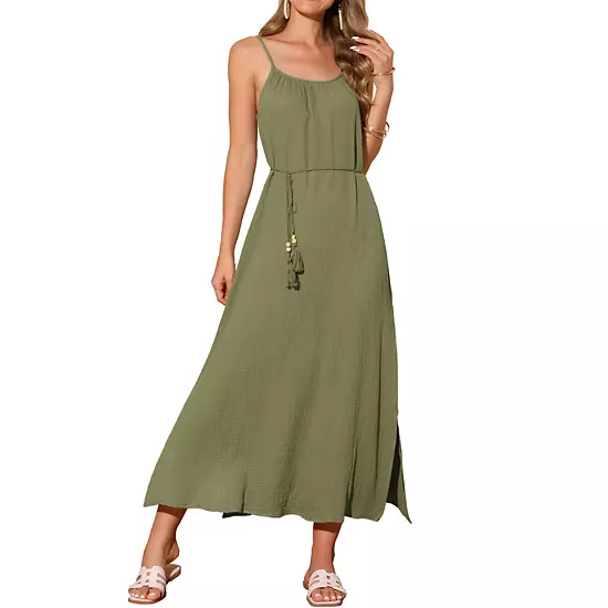 This maxi dress made from a cotton fabric, lightweight and flowy, ensuring exceptional comfort and breath ability; Features: This sleeveless dress with tassel belt, split thigh, loose fit, summer dress for women, spaghetti strap dress for women, cami dress for women, long flowy dress for women, a-line dress for women, women travel outfits; Style: This sundress features tassel tie detailing and adjustable shoulder straps, along with side slit, striking the perfect balance between style and comfort. Maxi long length, elongating your heights; Occasion : This long dress, with its simple yet elegant design, is perfect for vacation trips, casual beach outings, daily wear, parties, gatherings, picnic, and relaxing at home, bringing you coolness and comfort throughout the summer; Match: This cami dress has a chic and understated design that makes it easy to accessorize with your favorite jewelry and shoes.