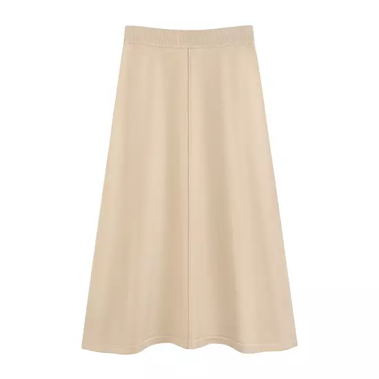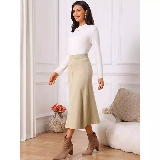 Fashion Style: Elastic High Waist/A-Line Hem; Elevate your wardrobe with this gorgeous elastic waist sweater skirt; The a-line and midi length create a stunning silhouette, while the knit fabric adds a cozy touch that’s perfect for fall and winter.