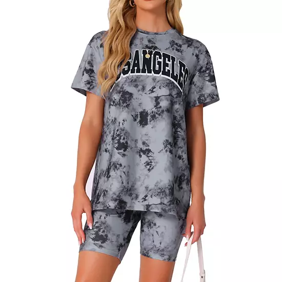 This tie dye lounge set feature a round neck and tie dye pattern, letters, adding functionality and stylish; Practical biker shorts for everyday wear in spring, summer, or fall; With a casual round neck, short sleeve shirt and slim shorts, this outfits biker shorts set is everything you need for cozy day-to-night wear or outfits wear; This pull-on tee is basic and classic, also a good choice for short-term going out, walking around, or shopping; unique tie dye pattern adding fashion and casual feel; this loungewear is suitable for sleeping, pajama party, outdoor, indoors, living room, bedroom, coffee, trip, travel, etc. Multi-use 2 piece lounge set, for cozy loungewear, or pair with sneakers and handbag for casual outfits look.