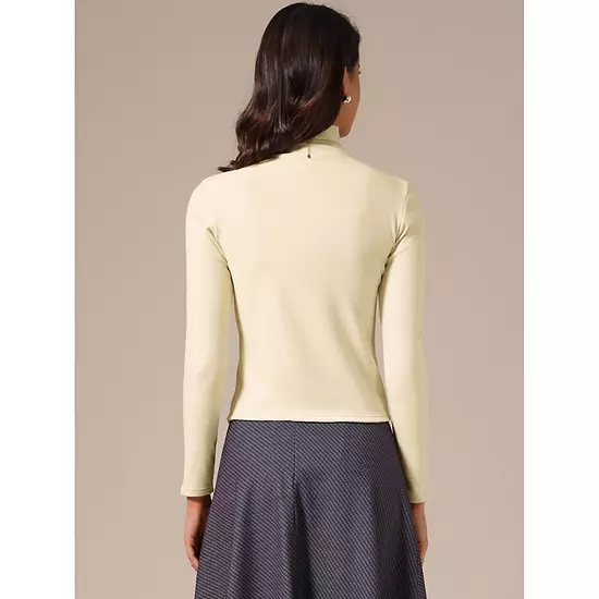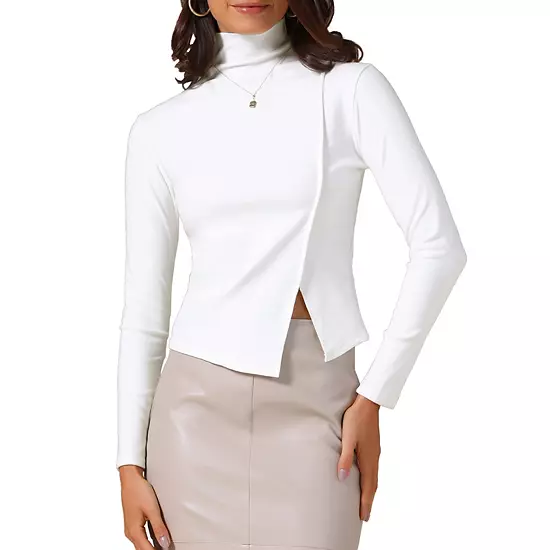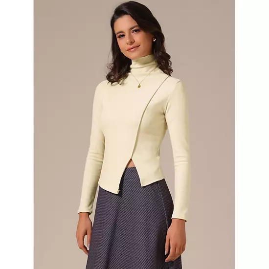 This turtleneck knit top is a versatile and chic addition to your wardrobe, offering both style and warmth; Slim fit design that flatters your figure; Thermal knit fabric that provides comfort and insulation; The asymmetrical hem gives a basic top a unique and modern twist; This turtleneck knit top is perfect for creating stylish and cozy outfits during the colder months.