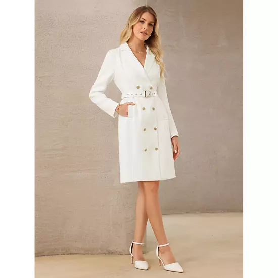 Keep your look elegant in this tweed dress, featuring tweed fabric, notch lapel collar, double breasted, knee length, fully lined; Pair with elegant necklace and high heels for a chic office look; Comfortable and classic, this semi-formal fall dress is perfect on its own or as a layer under a blazer or jacket; This blazer dress can be a perfect addition to almost any outfit from formal to daily wear, great for work, meeting, office, casual, daily dressing, etc.