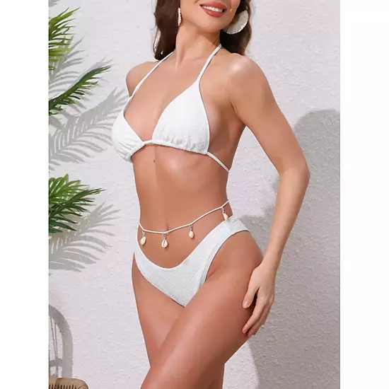 These bikini sets feature 2 pieces, solid color, self-tie, waffle knit textured, lace up halter bikini triangle top, double straps at the back, removable padded cups, no steel ring, high waisted triangle bottom, stretchy fabric, also comes with a shell waist rope decoration to show off your waist charm; Regular fit. Suitable for summer swimming, tropical vacation, beach party, swimming pool, bathing, resorts, honeymoon, cruise, etc.