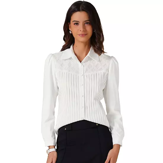 This top features a lace hollow out design at the front, making it suitable for everyday wear while looking extremely delicate; This elegant shirt is the perfect choice for both daily wear and the workplace; Perfect to pair with skinny jeans or wide leg pants for a business casual look.