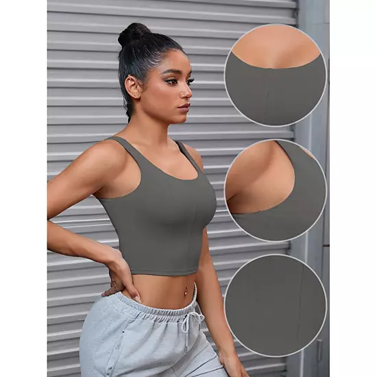 U Neck, Sleeveless, Workout, Slim Fit; Full coverage women sports bra can effectively provide additional support.; It is suitable for daily wear, fitness exercise etc; The U back detail not only offers a fashionable touch but also ensures comfort while you exercise; With padded cups providing shape and support, this sports bra cami crop is perfect for various fitness activities.