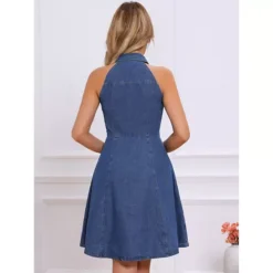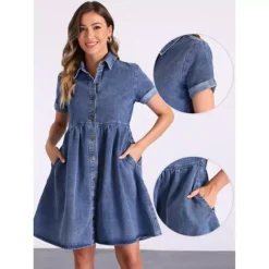 Denim Shirt Dress For Women’s Collared Button Down Short Sleeve Babydoll Jean Dresses With Pockets