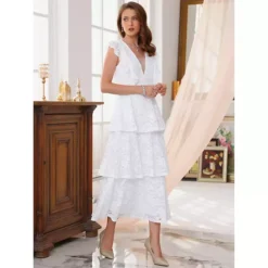 Women’s Lace Dress For Wedding Guest Cocktail Evening Ruffle Cap Sleeves Tiered A-Line Maxi Dresses