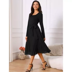 Women’s Fall Long Sleeve Dress Casual Crewneck Pleated A Line Flowy Midi Party Dresses With Belt